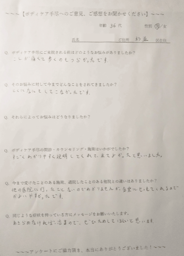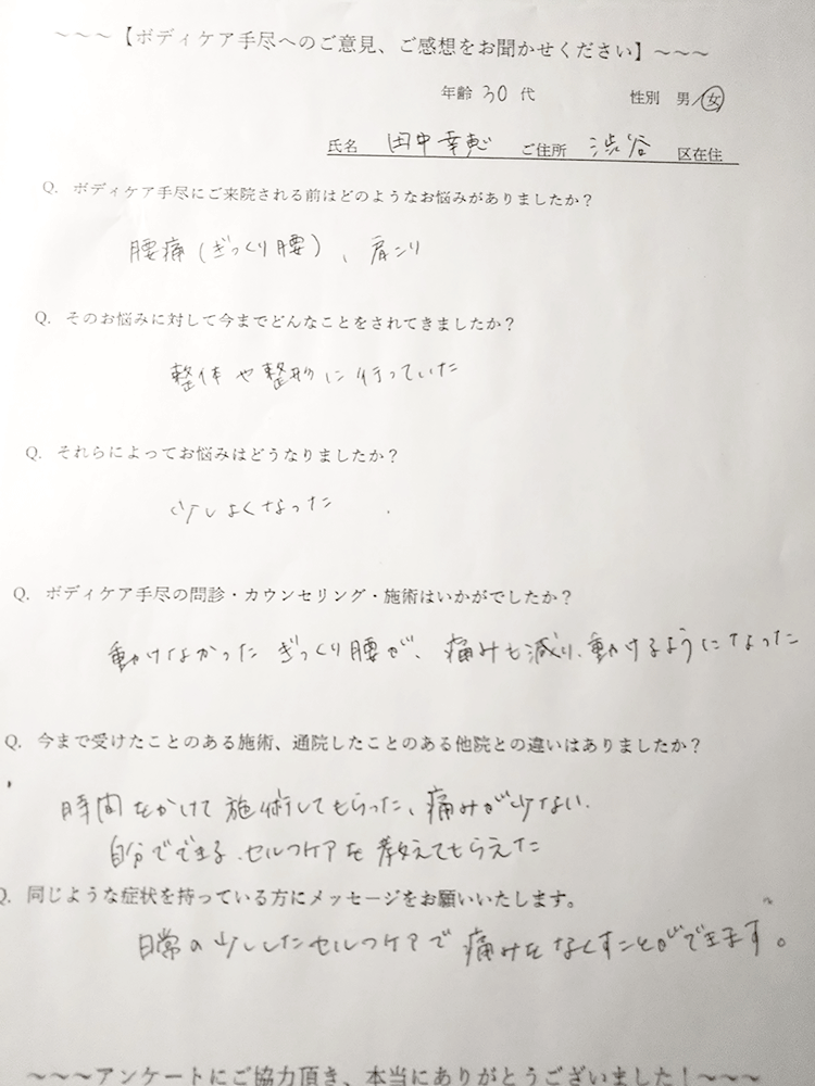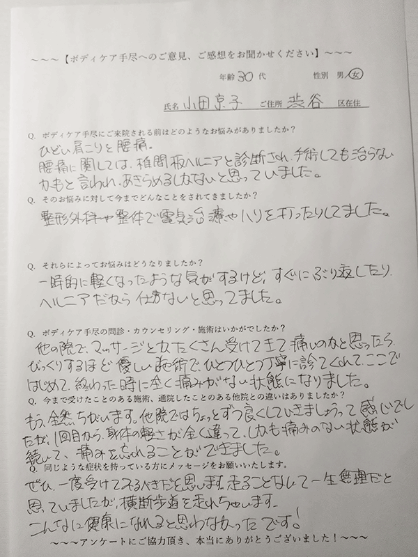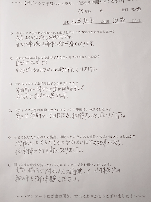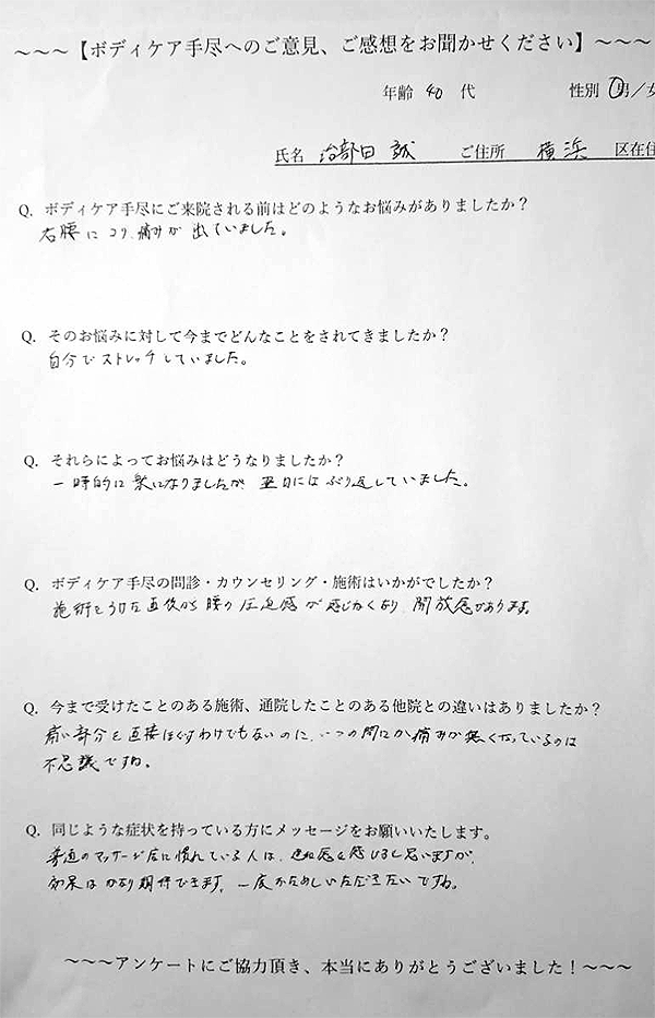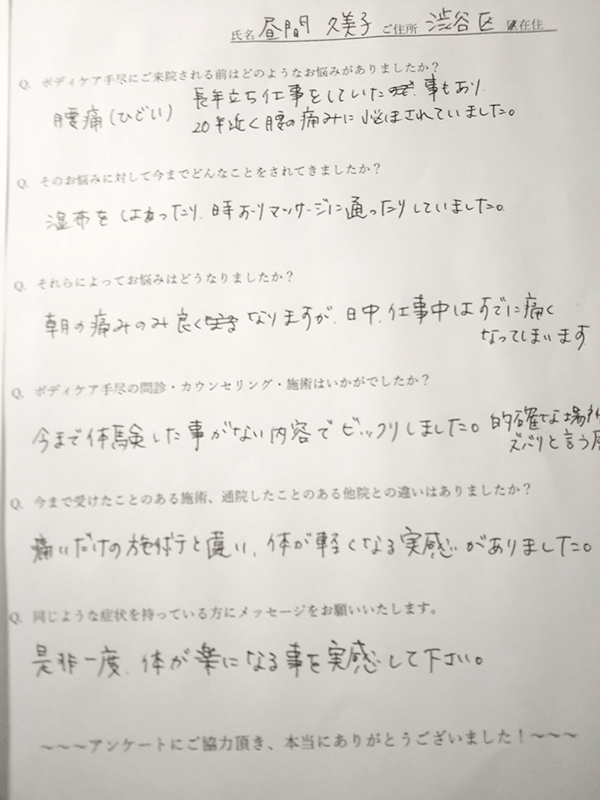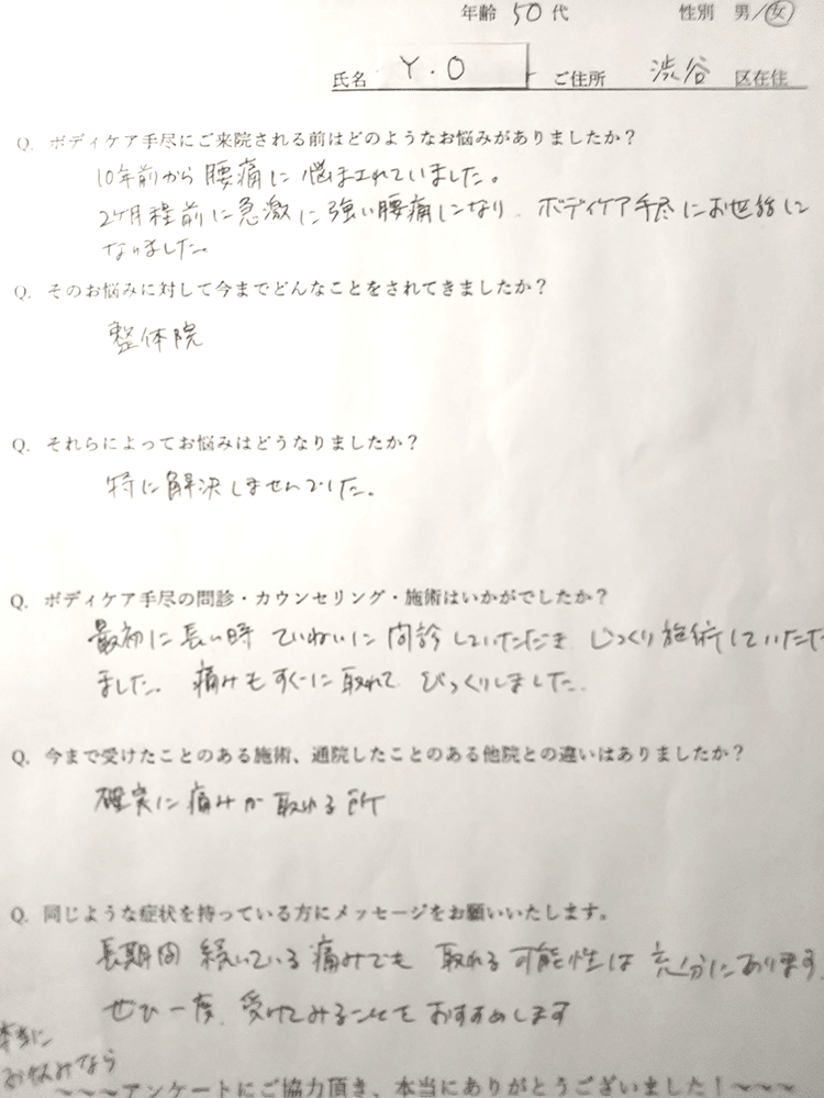 10年前から腰痛に悩まされていて、2ヵ月程前に急激に強い腰痛になり、ボディケア手尽にお世話になりました。