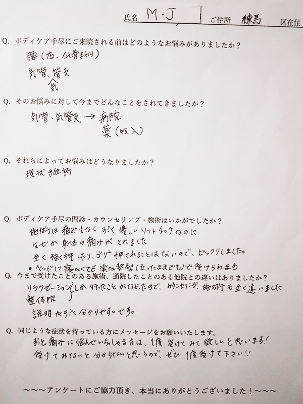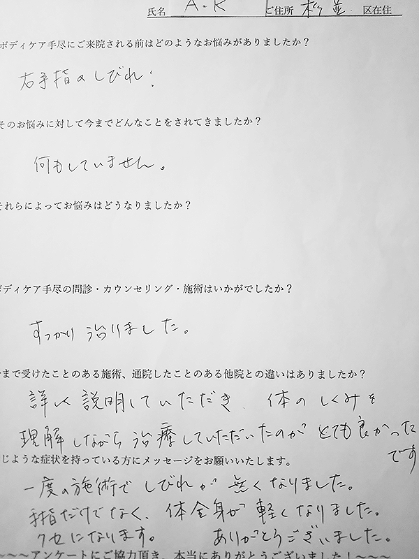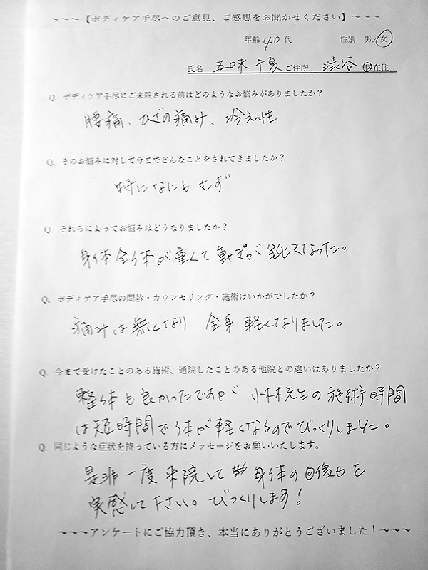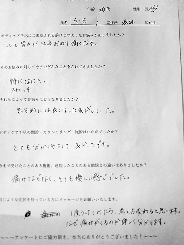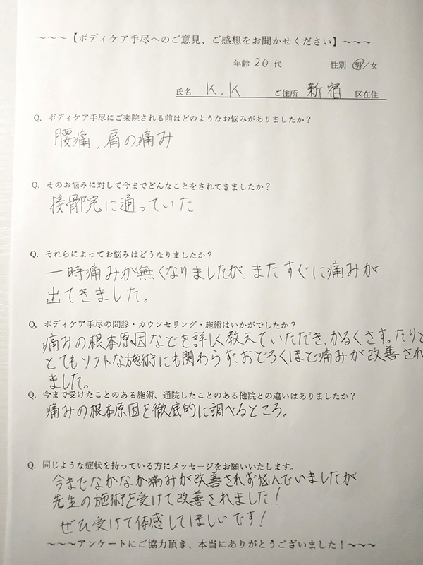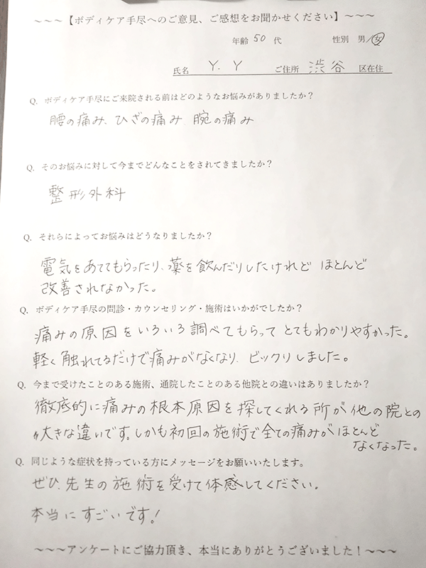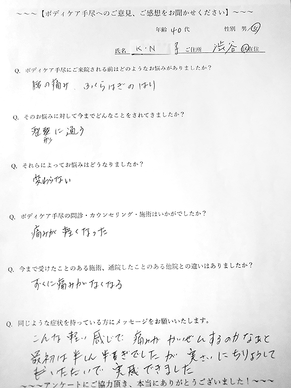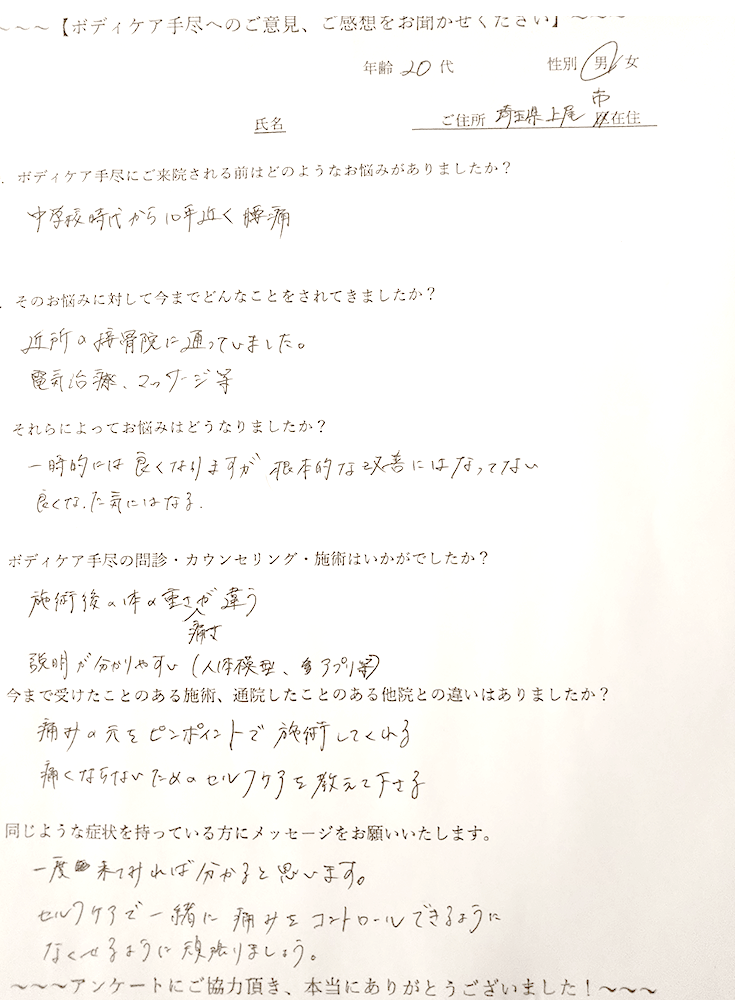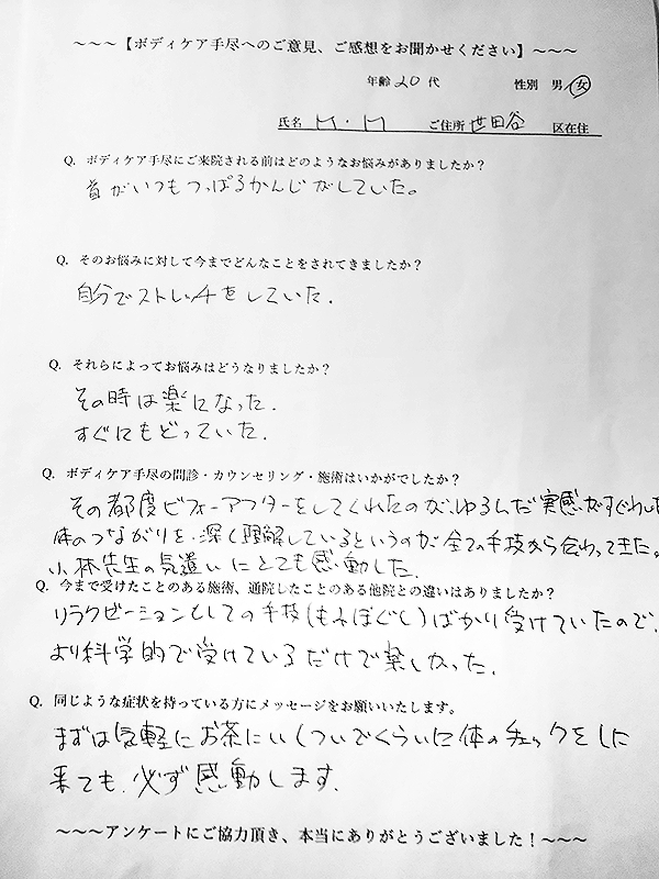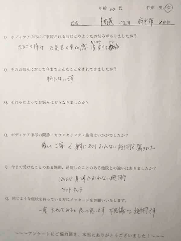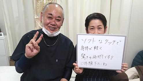 マッサージとかたくさん受けてきて、痛いのかと思ったら、びっくりするほど優しい施術で、ひとつひとつ丁寧に診てくれて、終わった時に、初めて全く痛みがない状態になりました。